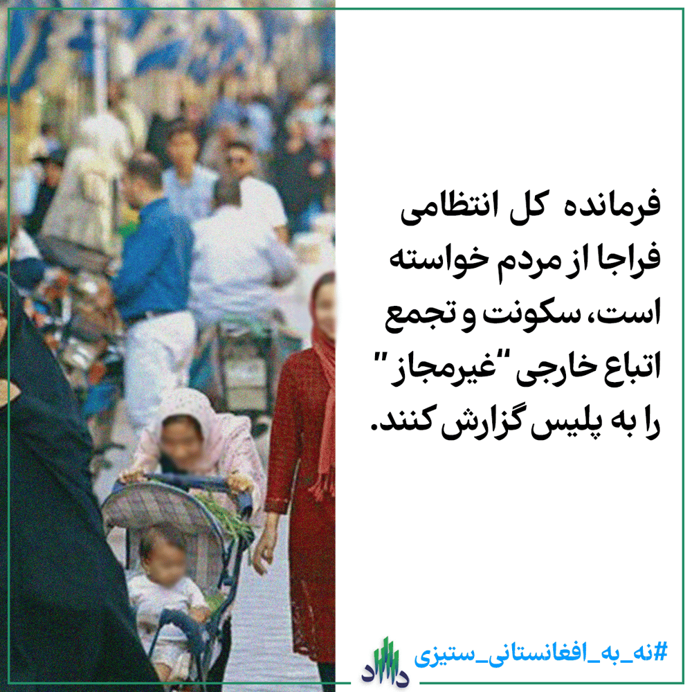 فرمانده کل انتظامی فراجا از مردم خواسته است، سکونت و تجمع اتباع خارجی “غیرمجاز ” را به پلیس گزارش کنند.