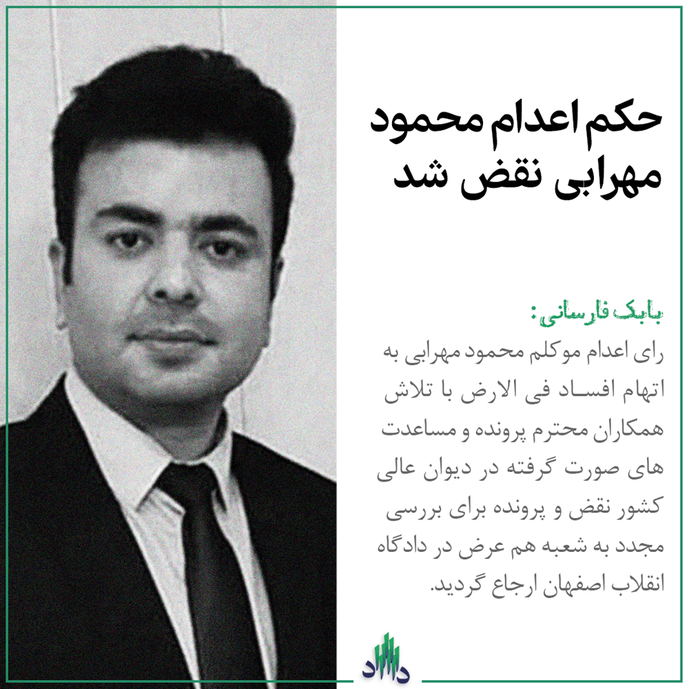 شامگاه یکشنبه ۱۵ مهرماه ۱۴۰۳ بابک فارسانی وکیل دادگستری از نقض حکم #اعدام #محمود_مهرابی جوان اهل مبارکه که در ۱۲ بهمن ۱۴۰۱ با اتهام «مفسد فی الارض» به اعدام محکوم شده بود ، توسط دیوان عالی کشور خبر داد. پیشتر چندین رسانه نوشتند؛ افشاگری فساد مسئولان شهری دلیل اصلی برخورد دستگاه قضاییه جمهوری اسلامی و صدور حکم اعدام برای او بوده است.