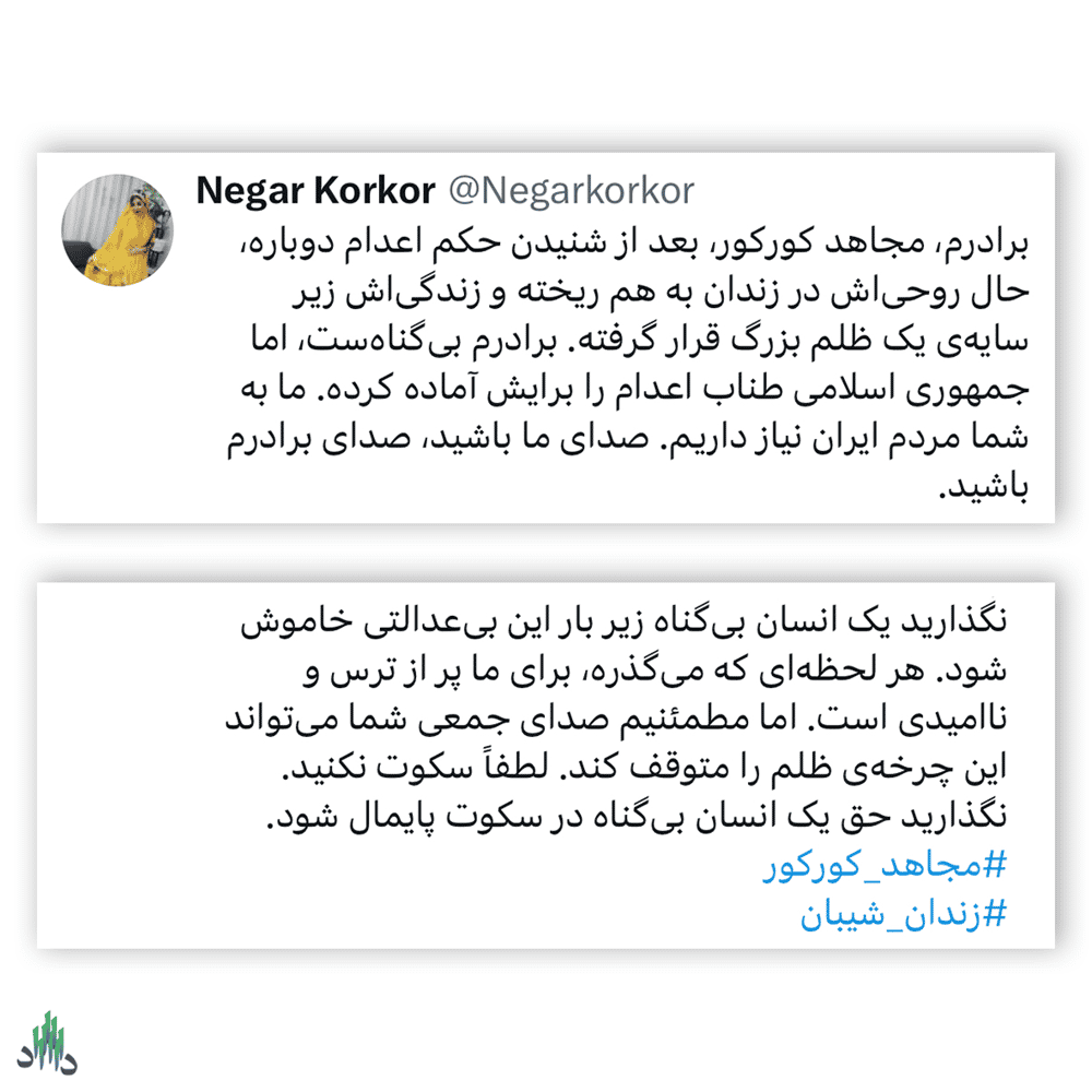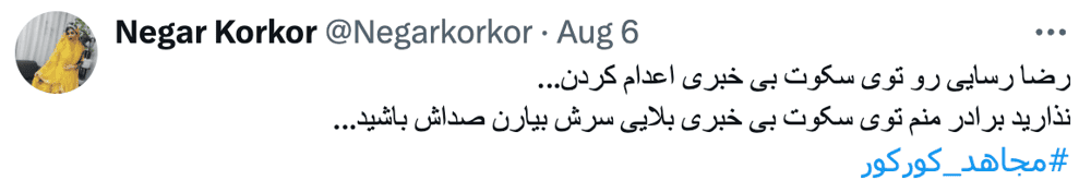 نگار کورکور در صفحه ی ایکس(توییتر) نوشت: «رضا رسایی رو توی سکوت بی خبری اعدام کردن... نذارید برادر منم توی سکوت بی خبری بلایی سرش بیارن صداش باشید...
